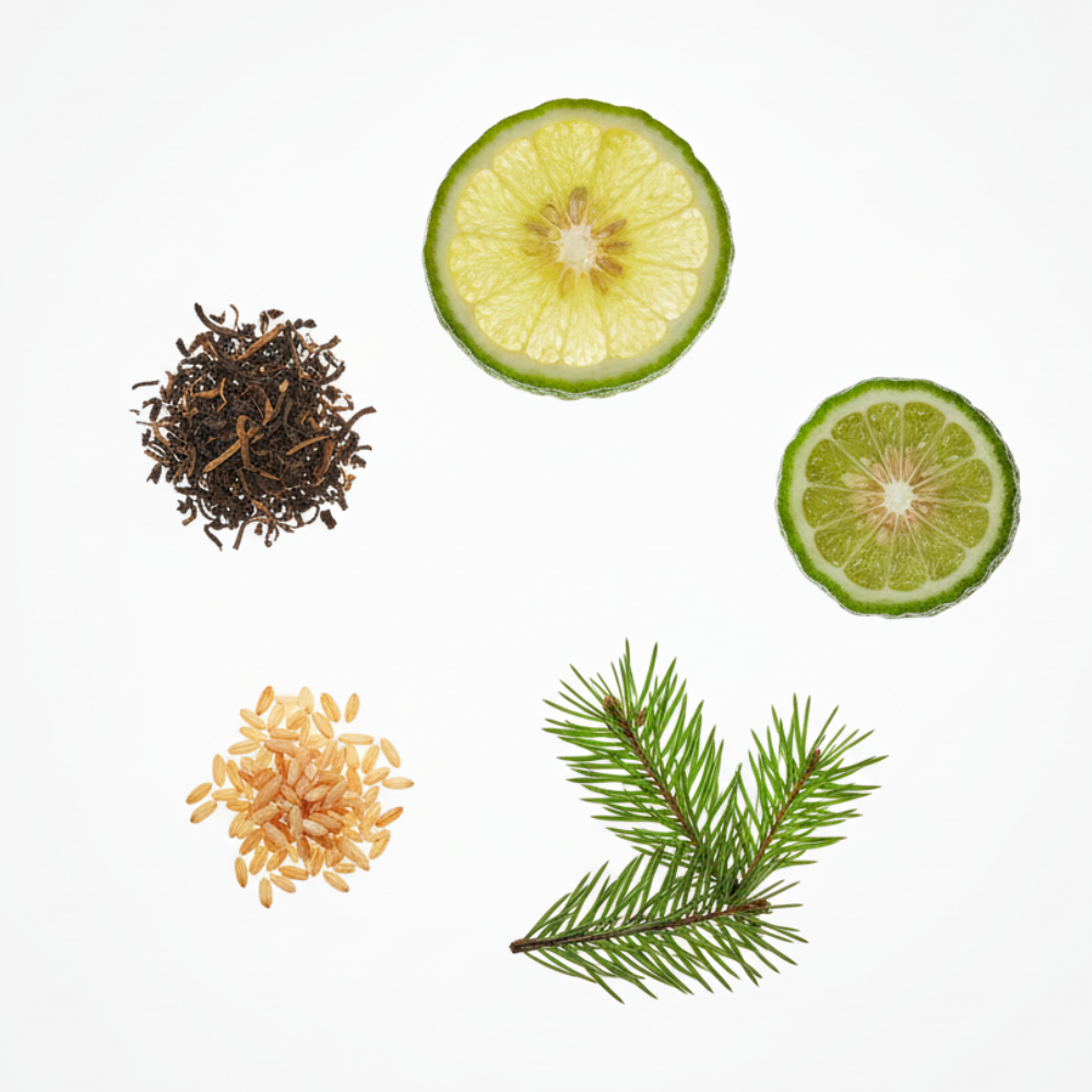 You sit in a quiet mountain teahouse as roasted tea swirls in the air, mixing with pine and dark wood. A flicker of lime cuts the warmth before sinking into silence. The scent is calm, deep, and steady like thought at twilight.