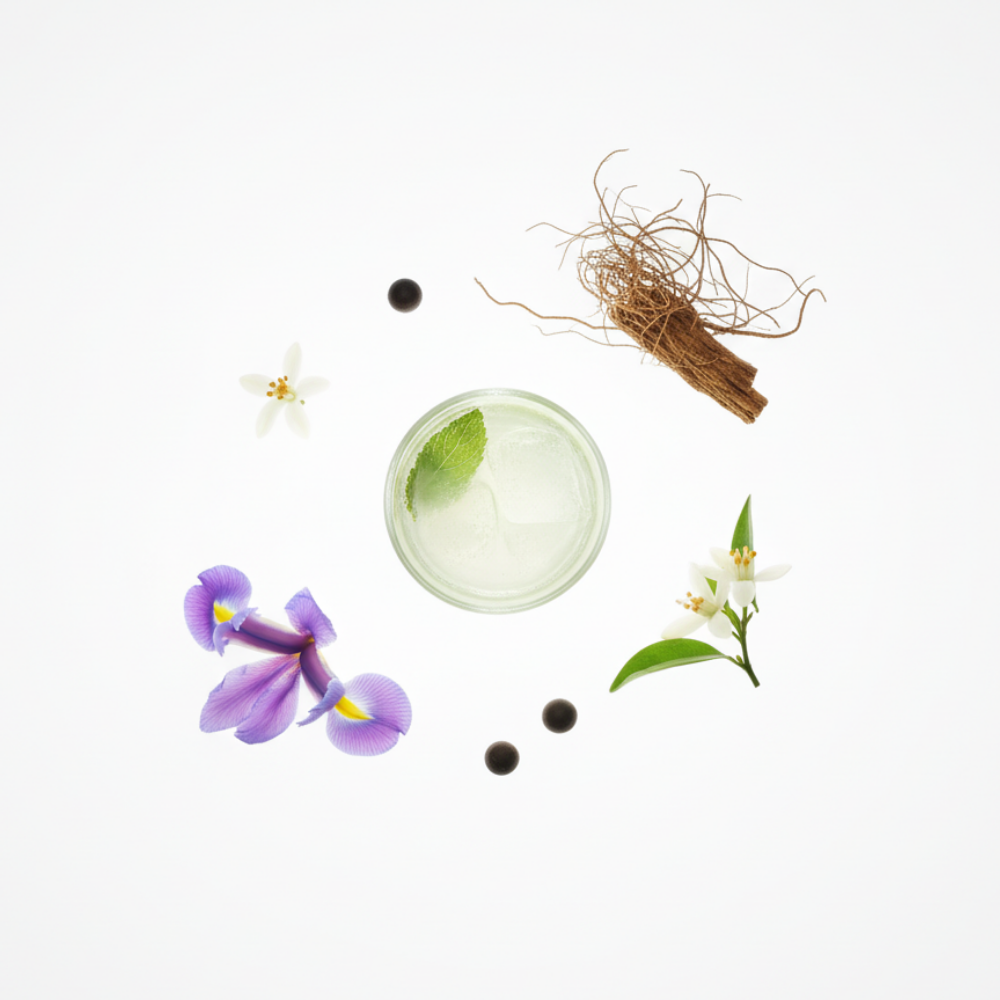 The unexpected heart blends floral iris and bright orange blossom with a hint of crisp mojito, deepening into a comforting, worn finish of dark, smoky guaiac wood and earthy vetiver.