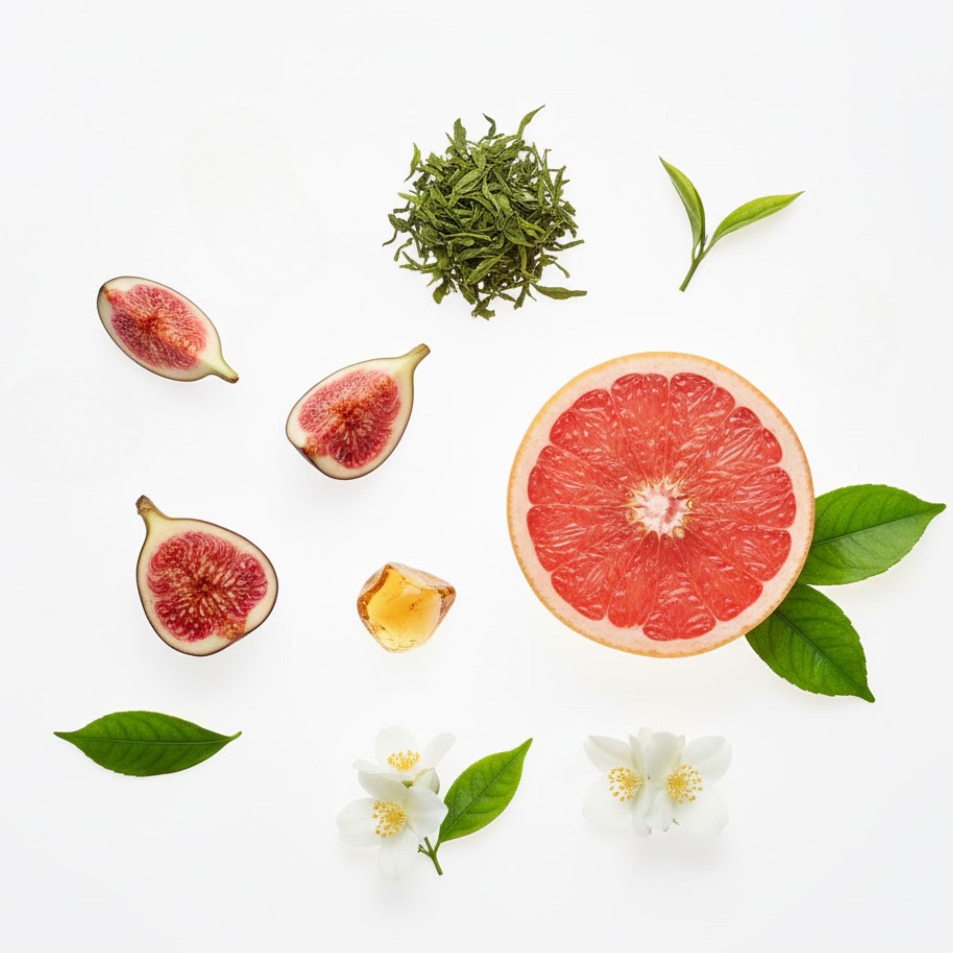 This refreshing opening leads into a tender, green embrace where the creamy sweetness of fig and the restorative calm of green tea reside, softened by the delicate presence of lily of the valley and jasmine.